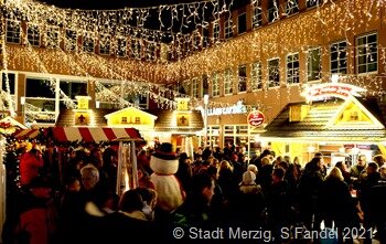 Der Weihnachtsmarkt wird am 25.11.2021 um 18 Uhr offiziell vom Merziger Bürgermeister Markus Hoffeld und dem Christkind auf der Bühne in der Veranstaltungsfläche im Rathaus–Innenhof eröffnet.