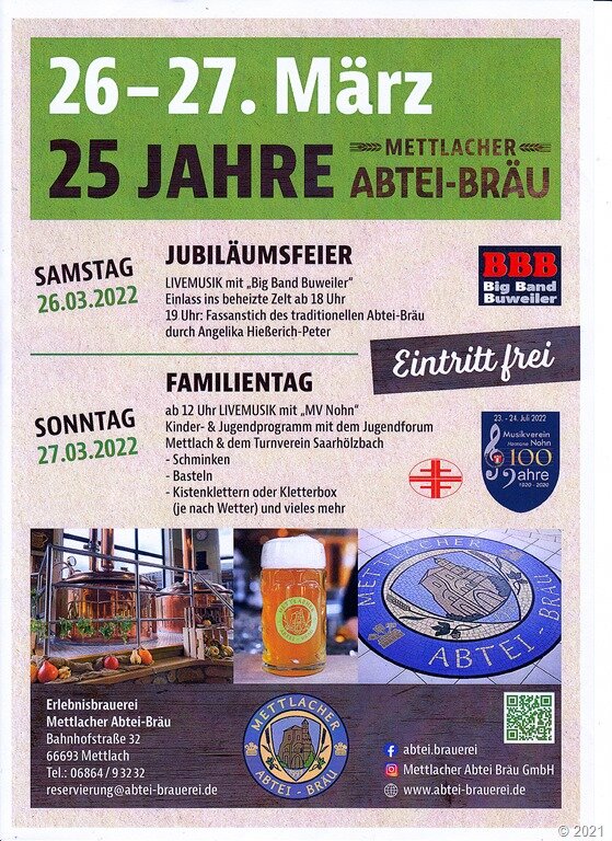 Die Erlebnisbrauerei Abtei-Bräu Mettlach feiert ein stolzes Jubiläum: Sie wird stolze 25 Jahre alt! Und das ist in unseren Tagen schon etwas ganz Besonderes, das gefeiert werden muss. Das wird es auch. Am kommenden Wochenende, dem 26. und 27. März.